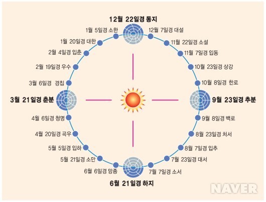 태양의 움직임(황도)에 따라, 1년을 24개로 나누어 정한 날들이다.