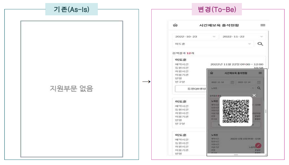 앞으로는 모바일 앱의 QR코드를 활용하여 시간제보육 등 · 하원시간을 기록할 수 있다.- 기존에는 현장 결제만 가능하여 등하원시 아이를 데리고 예약 건