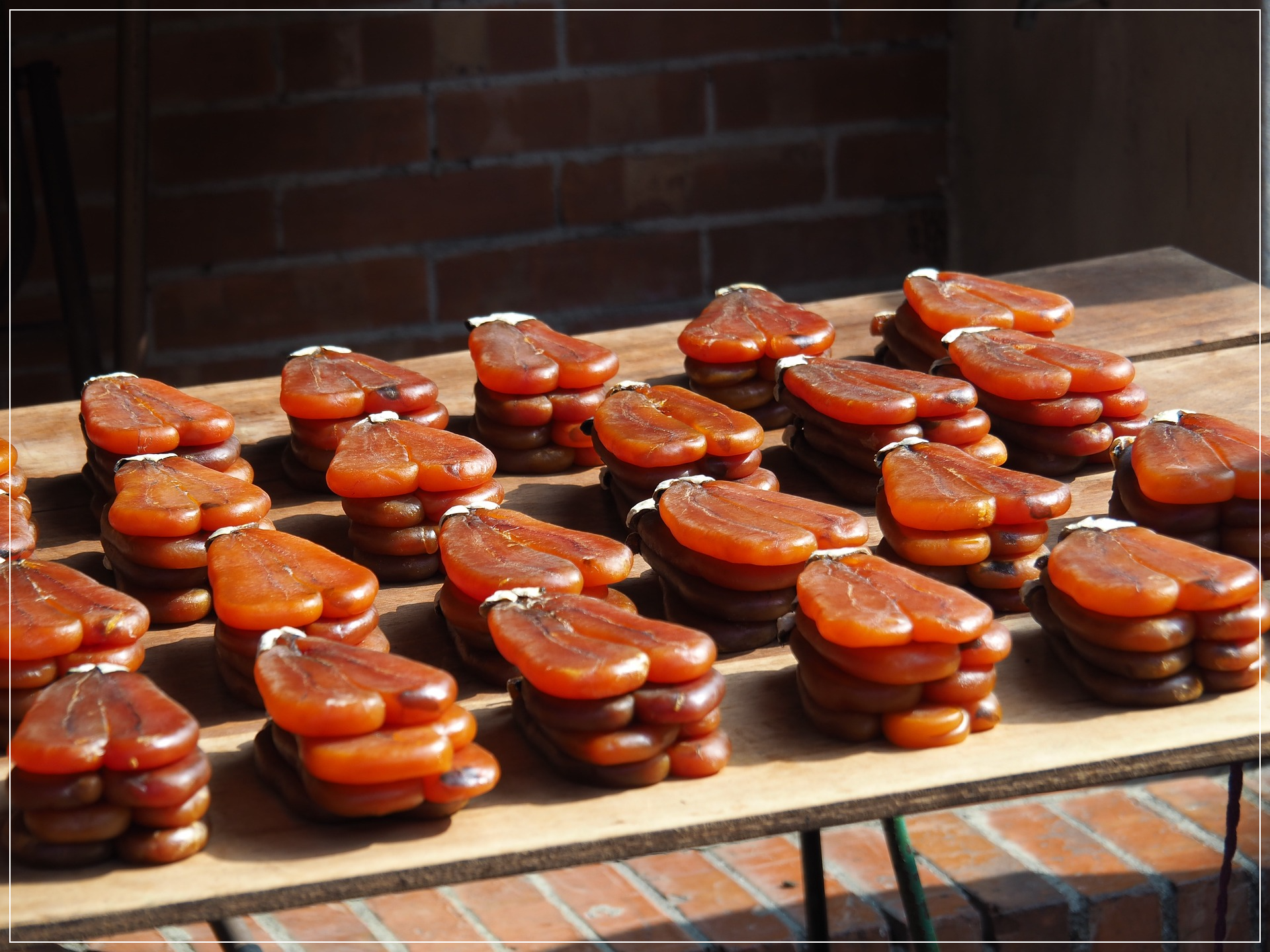 6. 건조시킬 때는 수시로 참기름을 발라 준다. 이 과정에서 기름기가 배어 나오면서 다갈색의 윤기가 흐르고, 20일이 경과하면 알이 단단해진다.