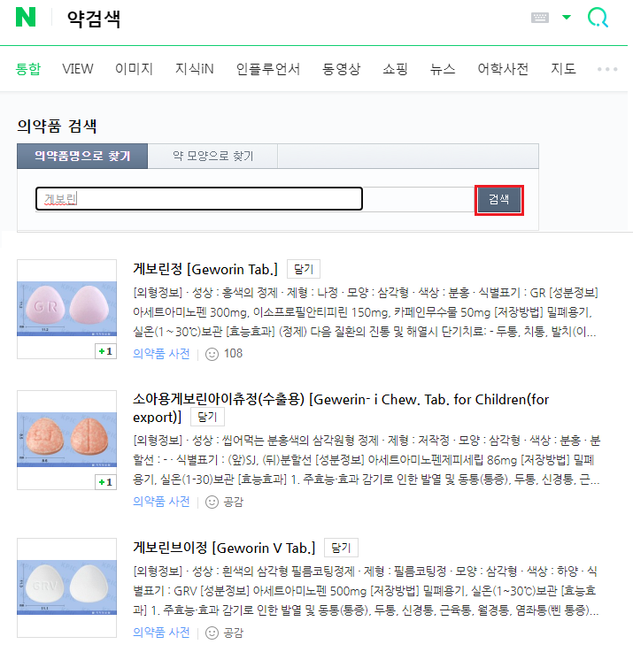 * 네이버 검색창에서 약검색을 검색하면 바로 내가 원하는 약을 검색할 수 있다.
