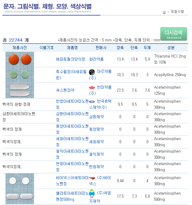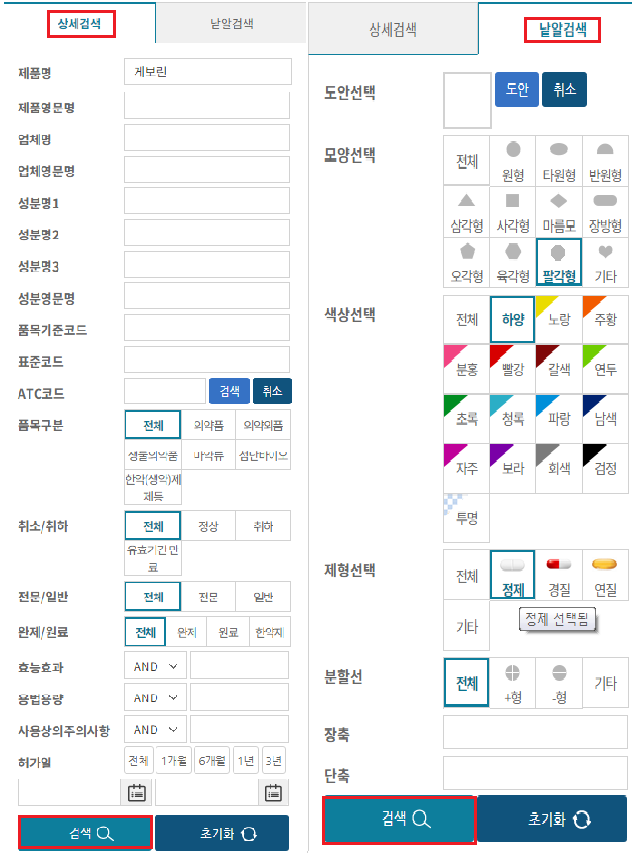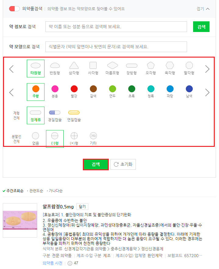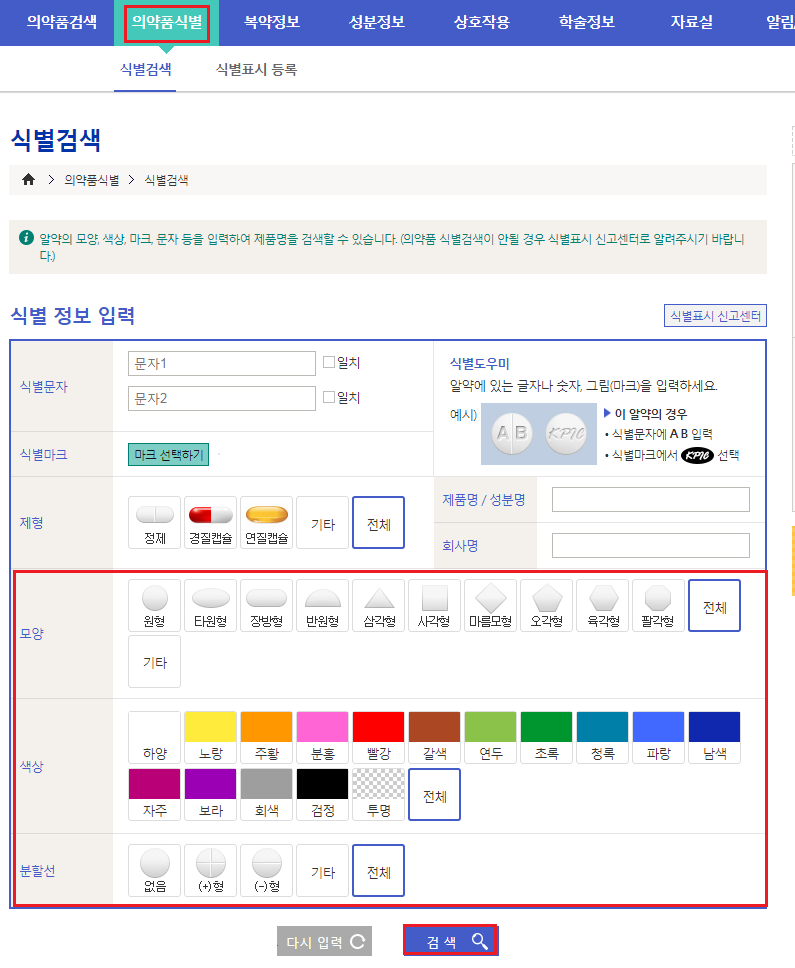 * 현재 가지고 있는 약 모양에 따라 모양, 색깔등을 선택하여 검색하면 된다.