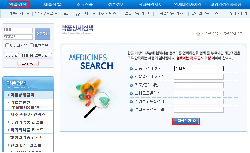 * 드럭인포는 약품 검색은 가능하지만 세부정보를 보기 위해서는 회원가입이 필요하다.